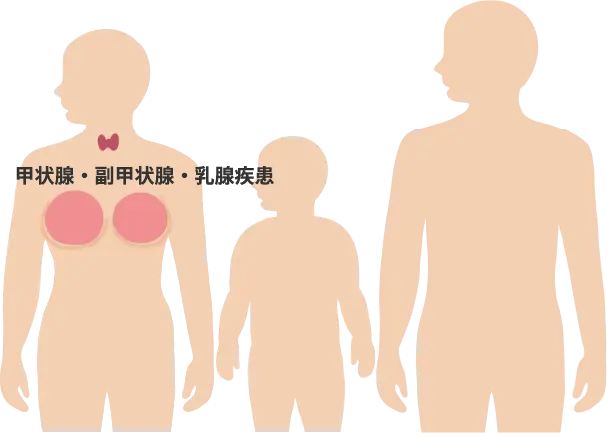 乳癌、線維線種、乳腺炎、甲状腺癌、甲状腺良性腫瘍、甲状腺機能亢進症(バセドウ病)、副甲状腺機能亢進症、副甲状腺腫瘍