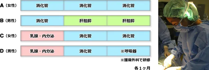 自分が希望する臓器別チーム(消化管、肝胆膵、乳腺・内分泌、小児)のいずれかのチームに所属し、チームの一員となって診療にあたります。チーム医療では、お互いを助け合い、補いながら多くの患者の診療を行っていきます。