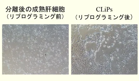 細胞移植治療においては大量の細胞群が必要であるものの、移植ソースには限界があります。近年、肝細胞を特定の小分子化合物を用いて培養すると化学的に誘導された肝前駆細胞(Chemically-induced Liver Progenitor; CLiPs)が作成されることが報告され、当科ではこのCLiPs投与を用いて肝疾患治療に取り組んでおります。さらに、本技術は患者自身の肝臓の一部切除した組織から分離した幹細胞を利用することが可能であることから、疾患患者の自家肝前駆細胞移植による治療を目指し研究を行っております。