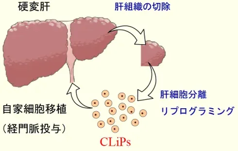 細胞移植治療においては大量の細胞群が必要であるものの、移植ソースには限界があります。近年、肝細胞を特定の小分子化合物を用いて培養すると化学的に誘導された肝前駆細胞(Chemically-induced Liver Progenitor; CLiPs)が作成されることが報告され、当科ではこのCLiPs投与を用いて肝疾患治療に取り組んでおります。さらに、本技術は患者自身の肝臓の一部切除した組織から分離した幹細胞を利用することが可能であることから、疾患患者の自家肝前駆細胞移植による治療を目指し研究を行っております。