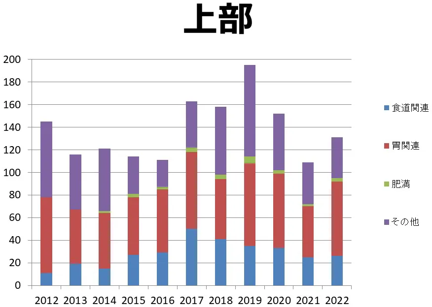 胃悪性腫瘍(癌、肉腫、悪性リンパ腫、GIST)、胃良性腫瘍、食道悪性腫瘍(癌、GIST)、食道アカラシア、食道裂孔ヘルニア 、十二指腸疾患、肥満症